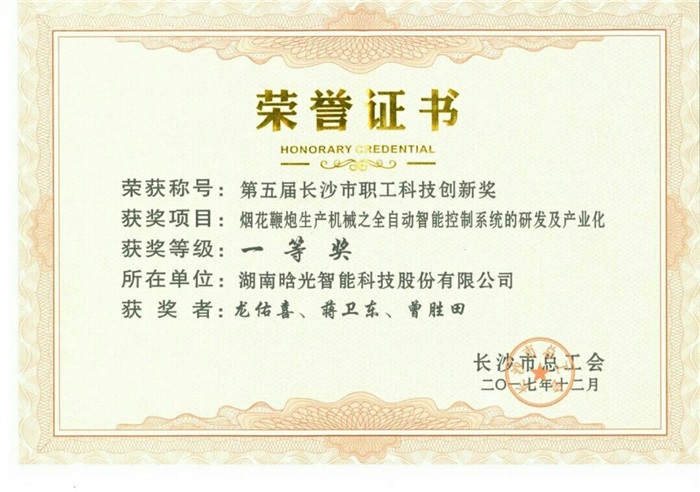 根据长沙市总工会长工发〔2017〕5 号文件《长沙市总工会关 于开展第五届长沙市职工科技创新奖评选及展示活动的通知》的精神,经基层工会推荐和专家评审,华智科技生物技术有限公司 郑秀婷等人完成的《SNP 分子标记开发》等5 个项目荣获一等奖。湖南湘电长沙水泵有限公司张铁等人完成的《电动循环水泵》等 20 个项目荣获二等奖,广汽三菱汽车有限公司杨德亮等人完成的 《一种涂胶胶枪加热装置》等30 个荣获三等奖。授予五个一等奖 的第一完成人郑秀婷、黄恺、戴煜、杨先乐、龙佑喜五位同志“长沙市五一劳动奖章”荣誉称号。