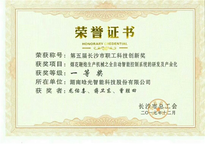 热烈祝贺晗光智能的研发项目获长沙市科技创新一等奖,项目技术带头人龙佑喜先生获长沙市五一劳动者奖章。